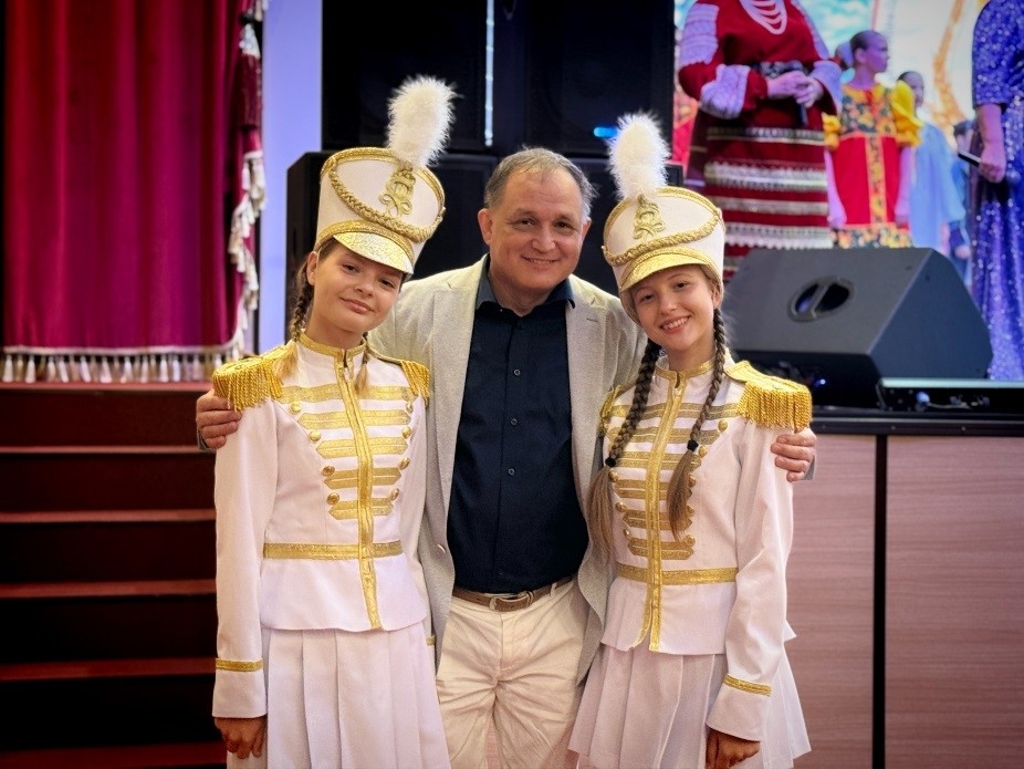 Арт-директор фестиваля Иван Белокрылов с юными артистками в гусарских костюмах на открытии фестиваля
