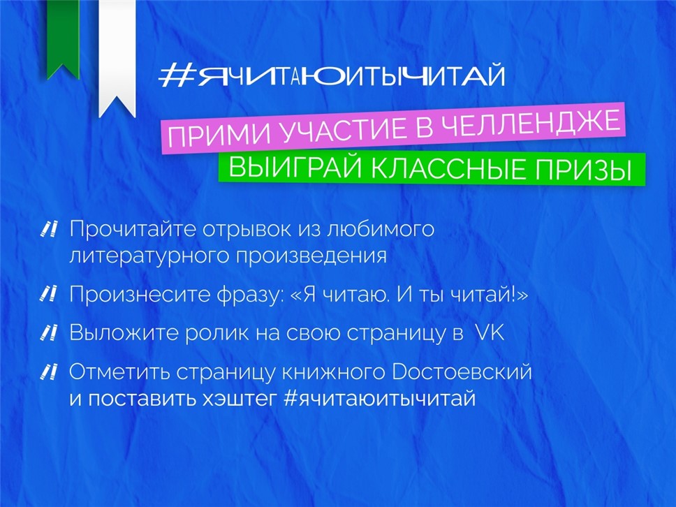 Для участия в нём нужно записать видео, на котором вы прочитаете отрывок из любимого литературного произведения, сказать в нём фразу "Я читаю. И ты читай!" и выложить видео на свою страницу в ВКонтакте с отметкой