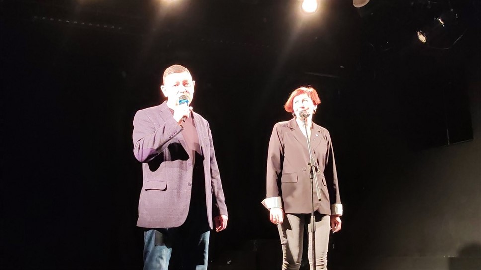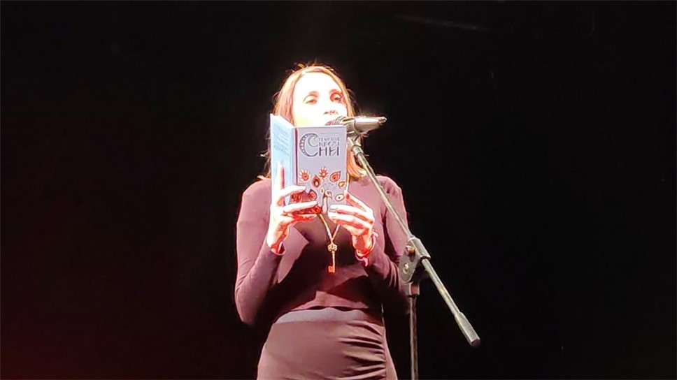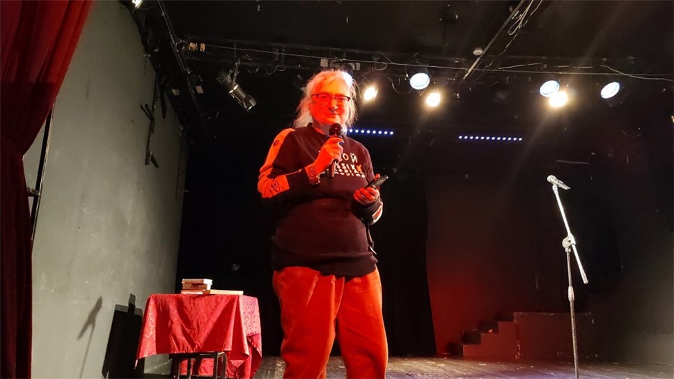 Затем Андрей Коровин торжественно представил премьеру стихов Марии Вихровой, которые никогда не звучали со сцены. Стихотворение посвящено трагикомической ситуации, когда автор заподозрила у себя смертельную болезнь и пошла с нею к врачу. Когда Мария читала: "