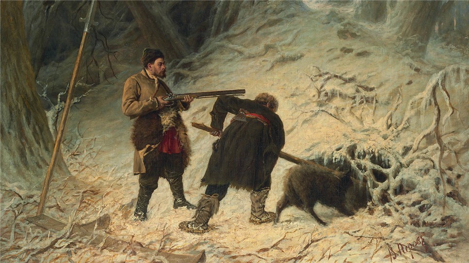 Картина "Охота на медведя зимой", на которой изображена сцена зимней осады на медведя в берлоге, происходит из частного собрания.