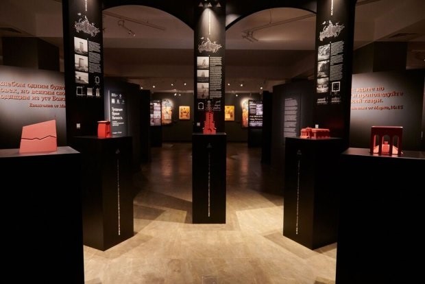 Экспозиция размещена на двух этажах. Планшеты с макетами современных церквей интегрированы в пространство, занятое подлинными старинными иконами и церковной утварью.