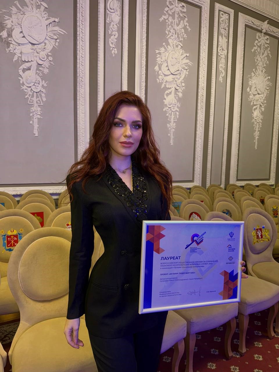 В номинации «Лучшая социальная инициатива» премию в этом году получила Алиса Супронова (Санкт-Петербург) — автор и руководитель интернационального проекта «Музыка подружит нас». Алиса Супронова — певица, автор-исполнитель, блогер и культурный деятель. Среди её наград — звание заслуженной артистки Чеченской Республики (2019) и ведомственные медали Министерства обороны РФ: «За вклад в укрепление обороны Российской Федерации» (2023) и «Участнику специальной военной операции» (2024), а также медаль «Генерал-майор Александр Александров» (2023).