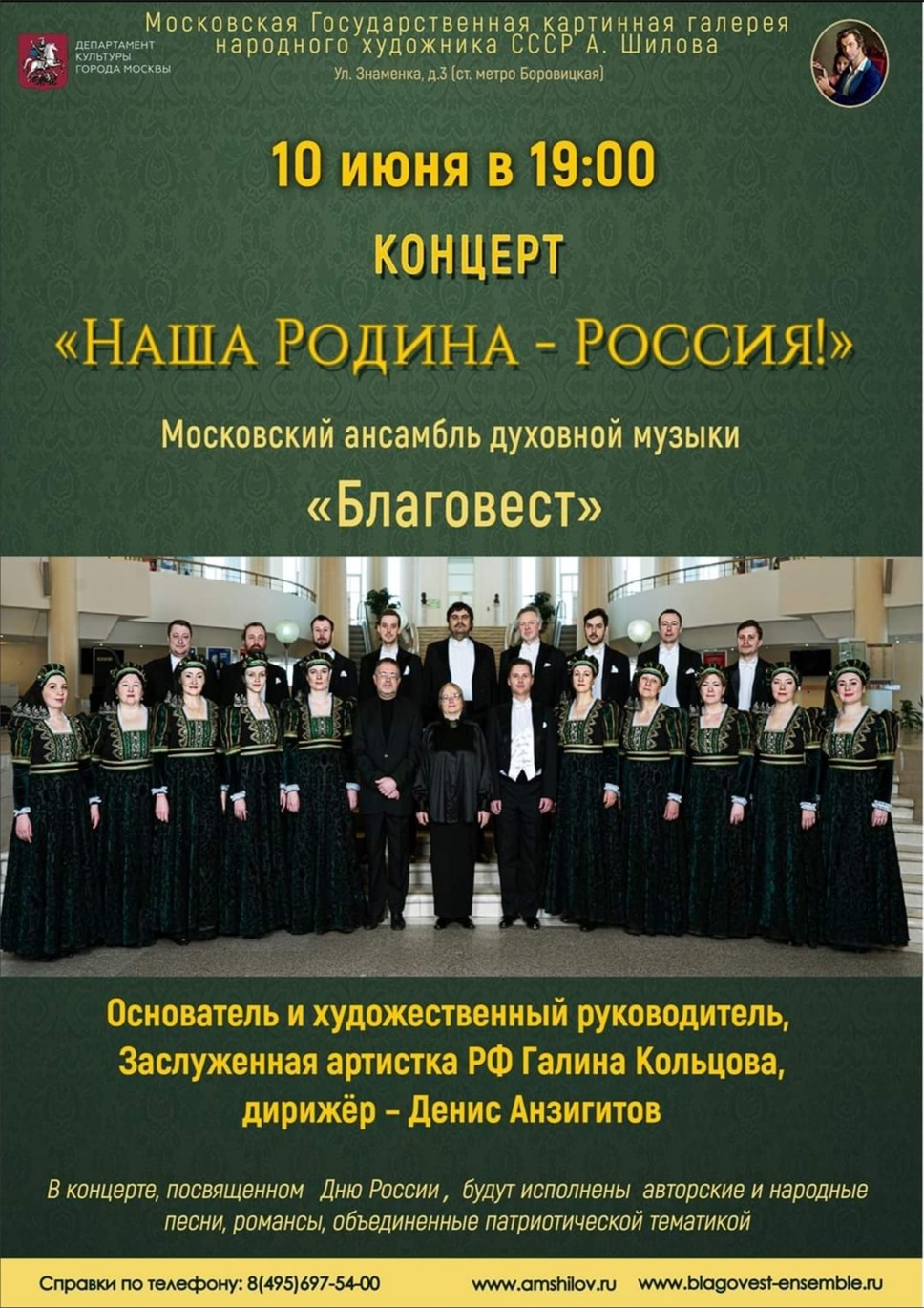 Московский ансамбль духовной музыки "Благовест" приглашает 10 июня в 19.00 на концерт "Наша Родина – Россия", который пройдёт в Картинной галерее А. Шилова (ул. Знаменка, д. 3).
