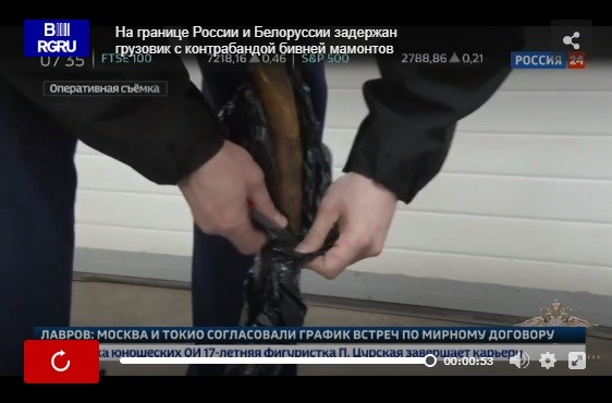 По данным МВД, сотрудники УГИБДД по Смоленской области на трассе Москва-Минск остановили грузовик, направлявшийся в Белоруссию. При досмотре груза обнаружилось, что он представляет собой бивни мамонта - как целые, так и фрагментированные. Всего в кузове было шестьдесят мешков особо ценных палеонтологических материалов, на вывоз которых нужны особые разрешения.