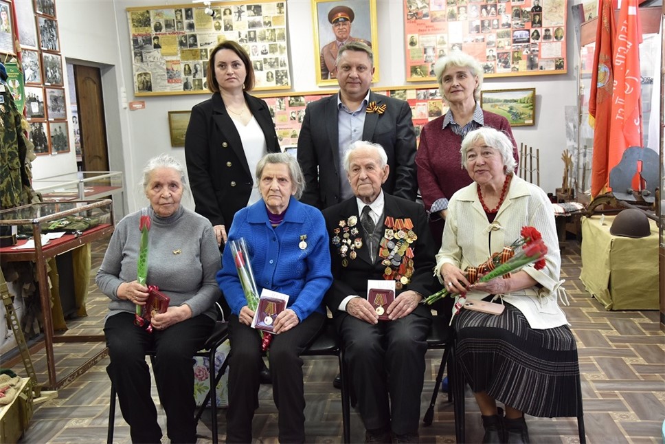 В.Г. Рогушков с супругой в музее на вручении юбилейной медали в честь 80-летия Победы Главой Чагодощенского муниципального округа А.В. Косёнковым (стоит за спиной ветерана). На задней стене – портрет маршала Жукова кисти В.Г. Рогушкова (из архива музея).
