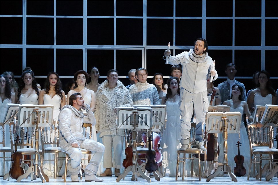 Интрига и изюминка любой постановки «Иоланты» – это решение финала, момент прозрения, что бы в это слово ни вкладывал режиссёр-постановщик. Здесь же, медленно начал отъезжать назад чёрный «вкладыш» левой половины сооружения, она становилась такой же, как и правая, и в самом финале обе половины заполнились счастливыми людьми в белых вязаных свитерах - эта «идеальная» сцена по стилистике походила на иллюстрацию к антиутопии Олдоса Хаксли «О дивный новый мир». Пожалуй, не то, что хотелось бы увидеть в кульминации спектакля.