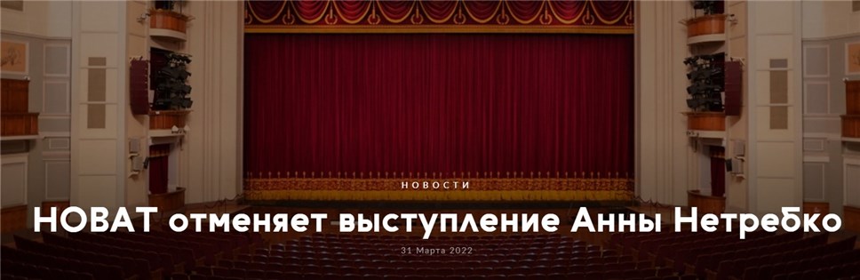 писал, что Баварская государственная опера и Нью-йоркская Метрополитен-опера разорвали отношения с Анной Нетребко, в связи с тем, что певица не признала требование отказаться от публичной поддержки президента России Владимира Путина на фоне украинских событий. А 2 марта продюсер Анны Нетребко Максим Берин рассказал прессе о ее решении приостановить творческую деятельность на ближайшее время.