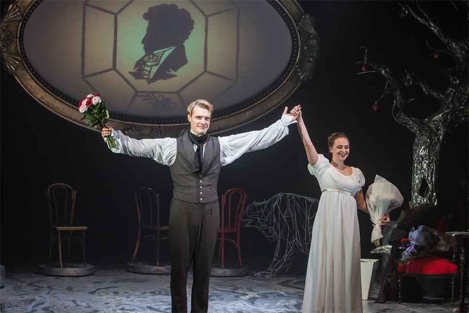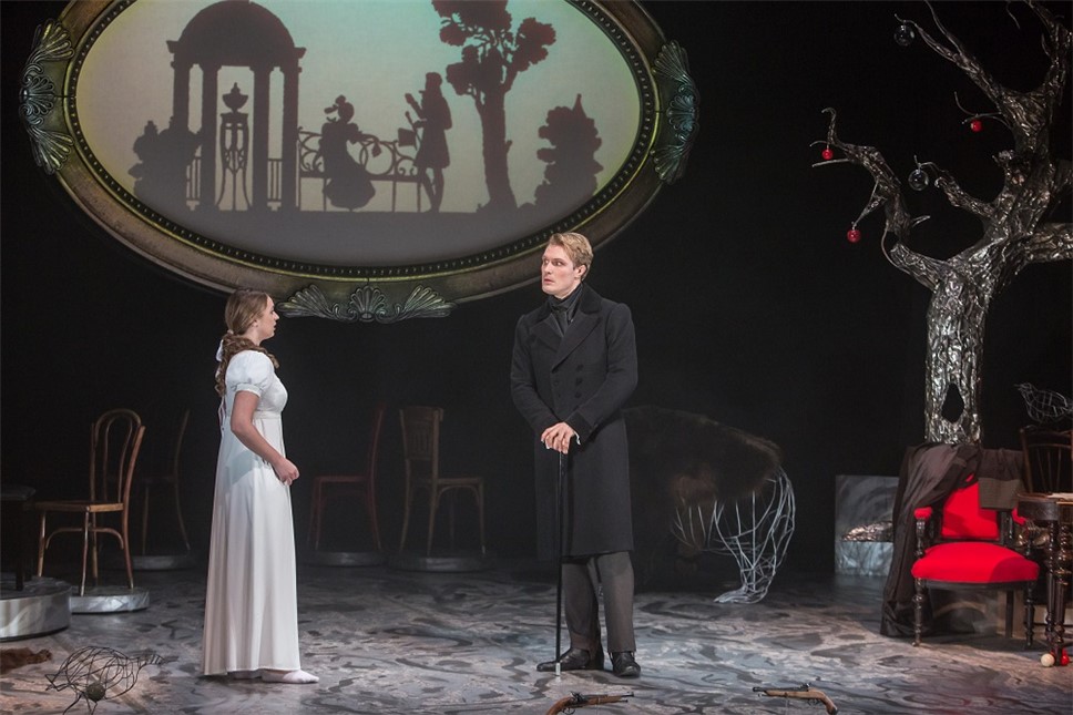 Кстати, интересно продумана сценография (художник-постановщик Роман Муромцев). Здесь работает каждая деталь на раскрытие психологической драмы, а не только сюжета. Огромное сухое черное дерево покрыто красными яблоками-шарами, которые иногда превращаются в бильярдные шары. Шкура медведя наброшена на проволочный каркас. Наконец, овальный экран с видео-проекциями из теневых иллюстраций художников Владимира Свитальского и Василия Гельмерсена дают представление не только о драме героев, но и о России позапрошлого века. Эта широта обзора и при этом особая бережная интонация к пушкинскому наследию — наверное, главная особенность необычного спектакля.