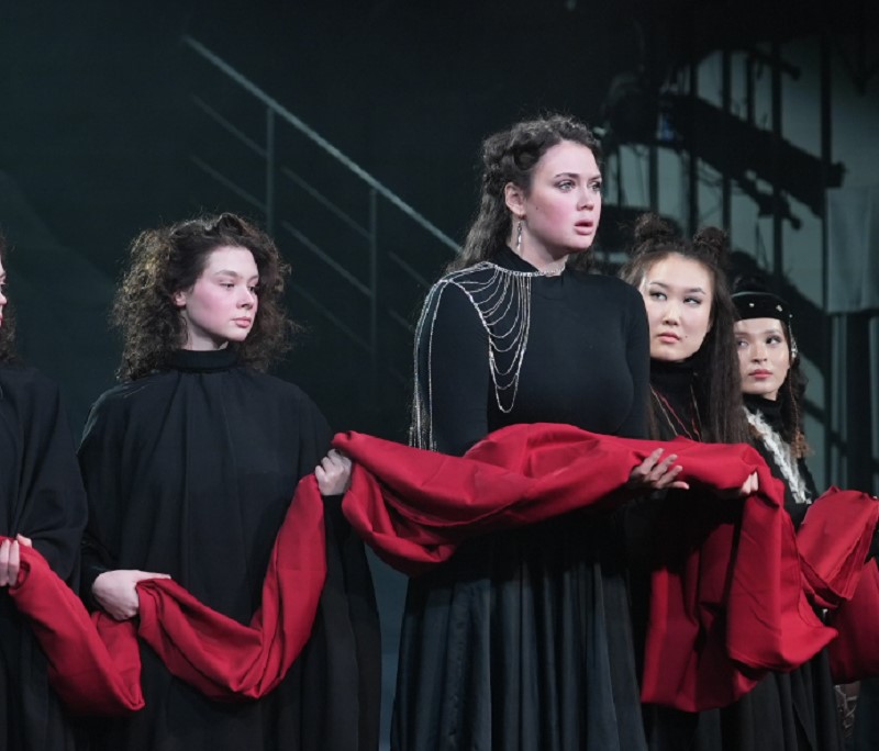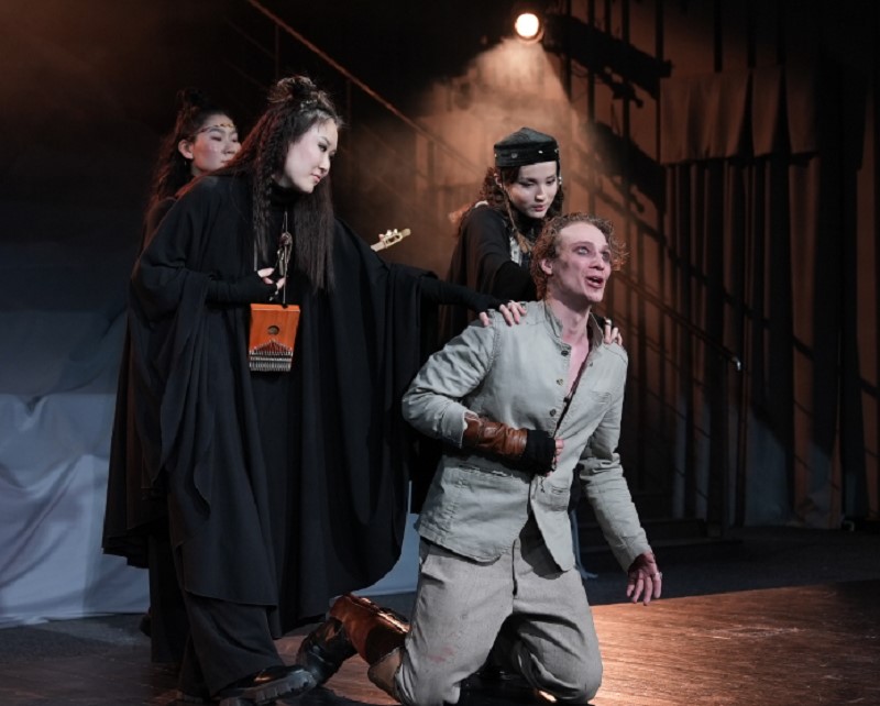 Этот азиатский инструмент был взят не просто так. Роли ведьм исполняли три студентки с ярко выраженной восточной внешностью (Акгуль Жарылгасын, Мария Манджиева, Дельгира Горяева), отчего колдовские образы получились с одной стороны потусторонними, с другой стороны – утонченными (так тонко и проникновенно могут сыграть только восточные женщины).