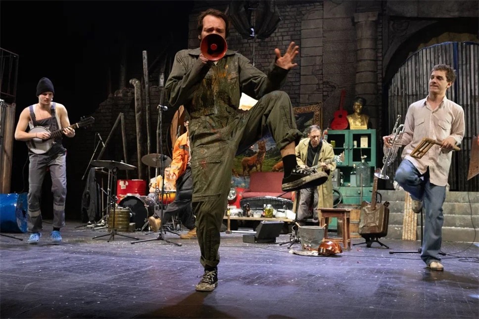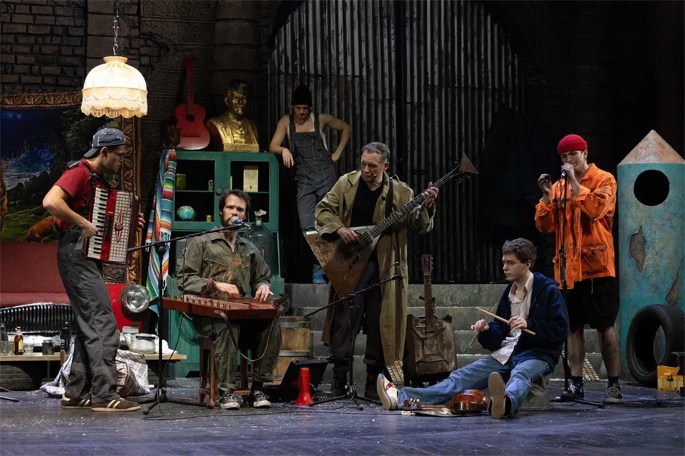 Несколько мужиков играют в группе и репетируют программу. Поэтому спектакль начинается аж с трех песен. (Песни, кстати, хорошие, сыграны интересно, разнообразно, но для действия было бы достаточно и одной). Если первые две песни зал встречал аплодисментами, то после третьей воцарилась недоуменная тишина. Зачем так много? Показали, что рок-группа репетирует, и хватит. Мы же в театре, а не на концерте.