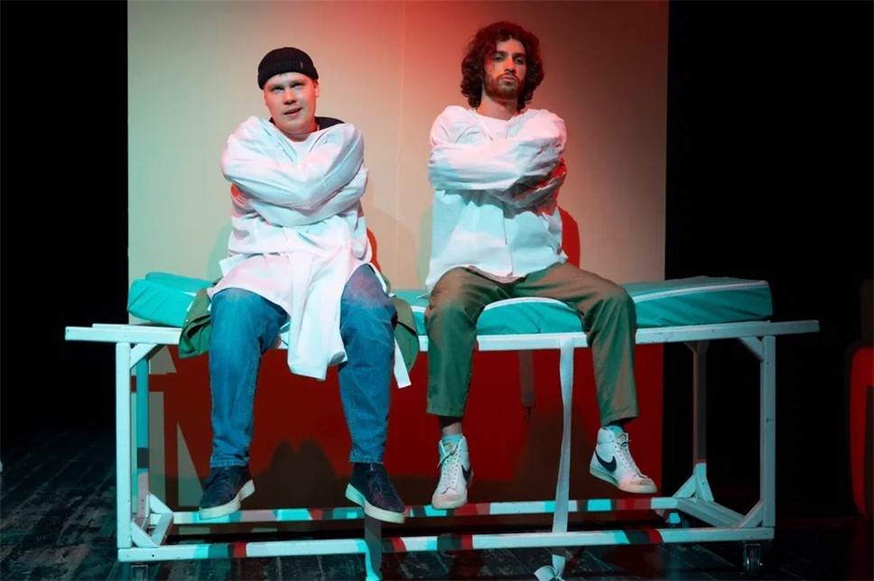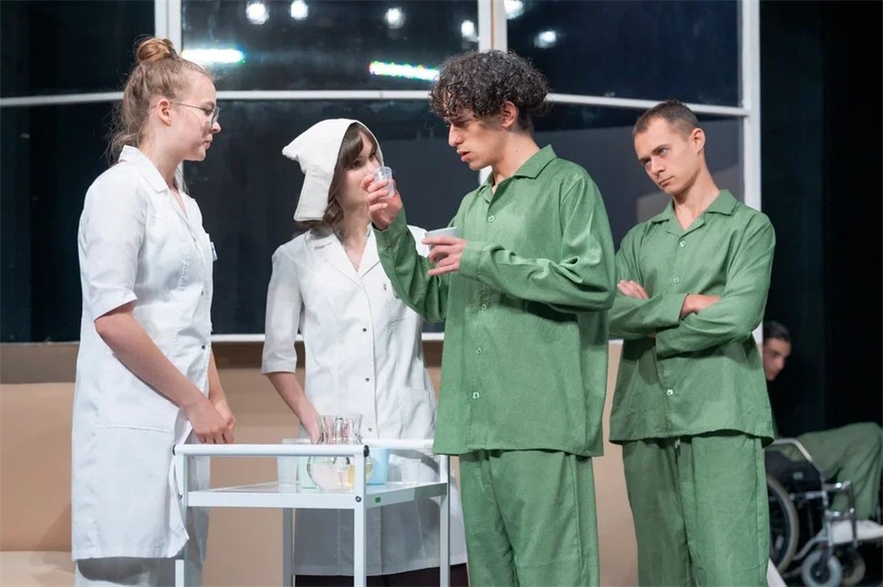 Начало спектакля достаточно невнятное. И в этом вина, разумеется, не ребят, а режиссера. Если перед студентами ставится задача сыграть психически больных людей, то надо бы им рассказать о том, какие у этих героев диагнозы (тем более, что у Кена Кизи они названы), потом дать им почитать учебники по психиатрии, чтобы студенты узнали о том, какие признаки у этих болезней, как ведут себя больные. Тогда сложились бы образы. Противоречивые, но честные.