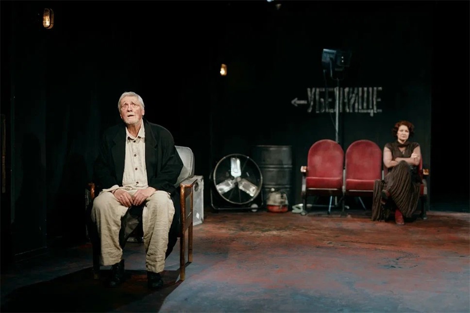 Спектакль перебивается бомбежками, после очередных взрывов гаснет свет, Сэр Джон стоит на коленях, но это не раскаяние, не страх, не ужас: он настоящий рыцарь, готовый идти до конца.