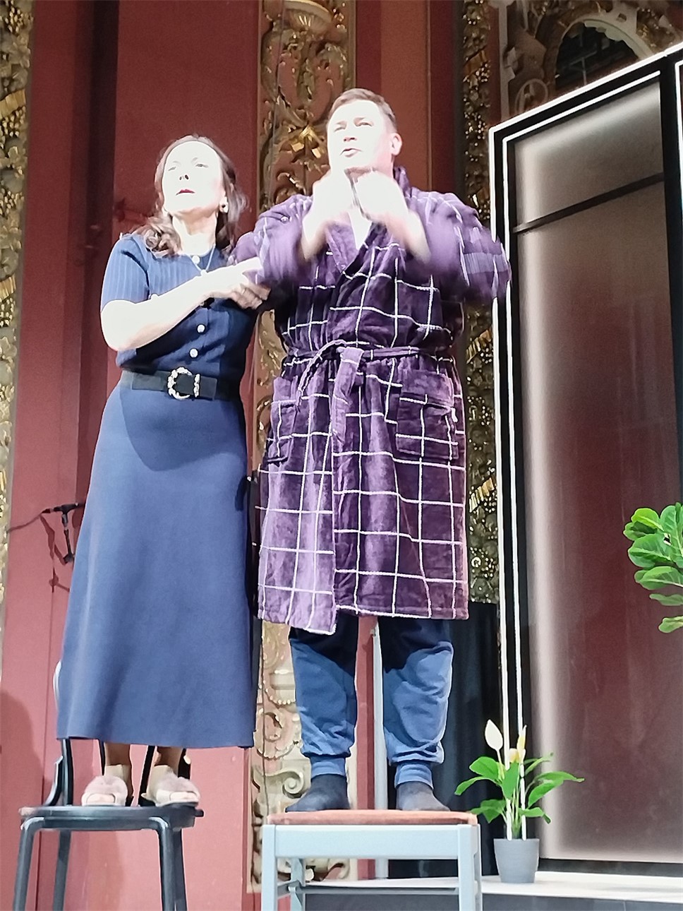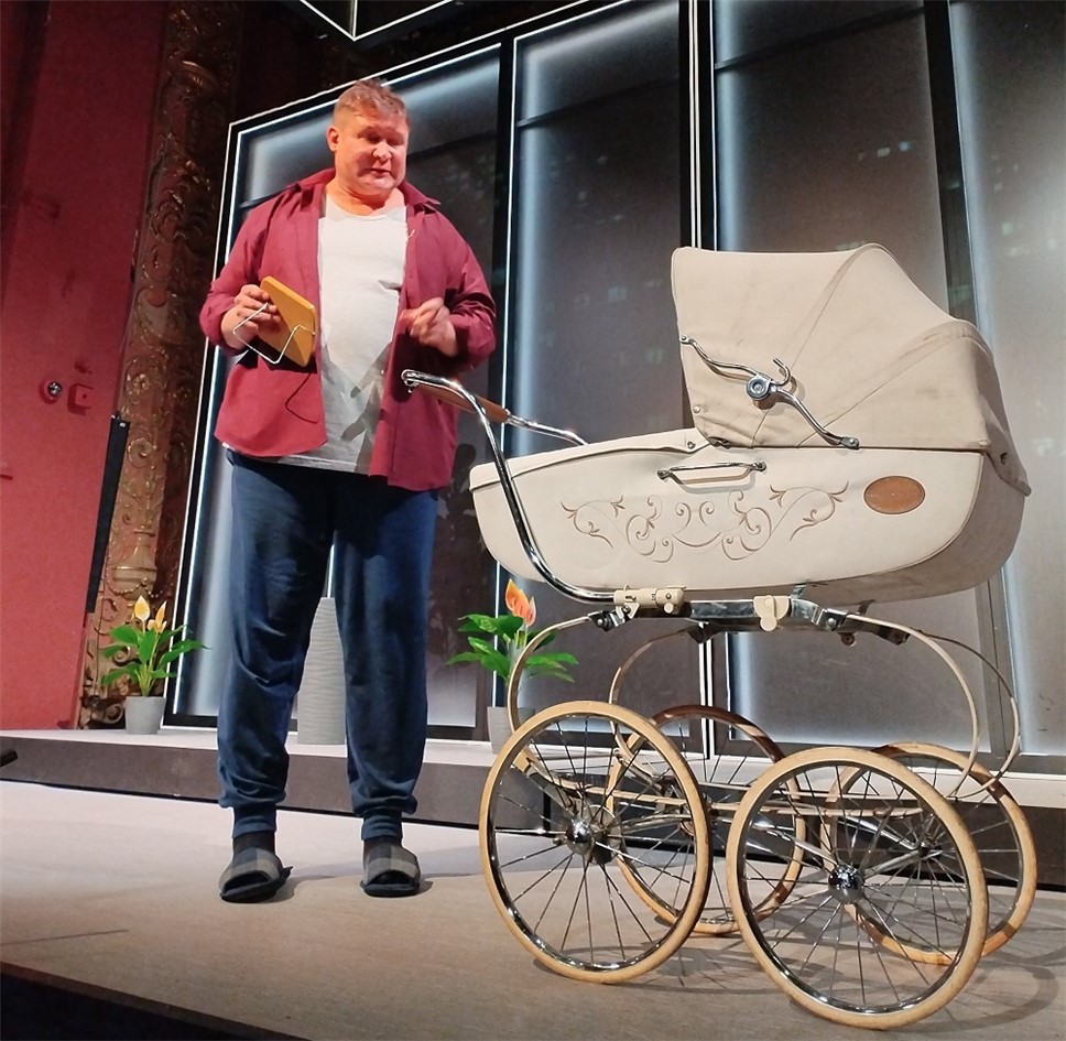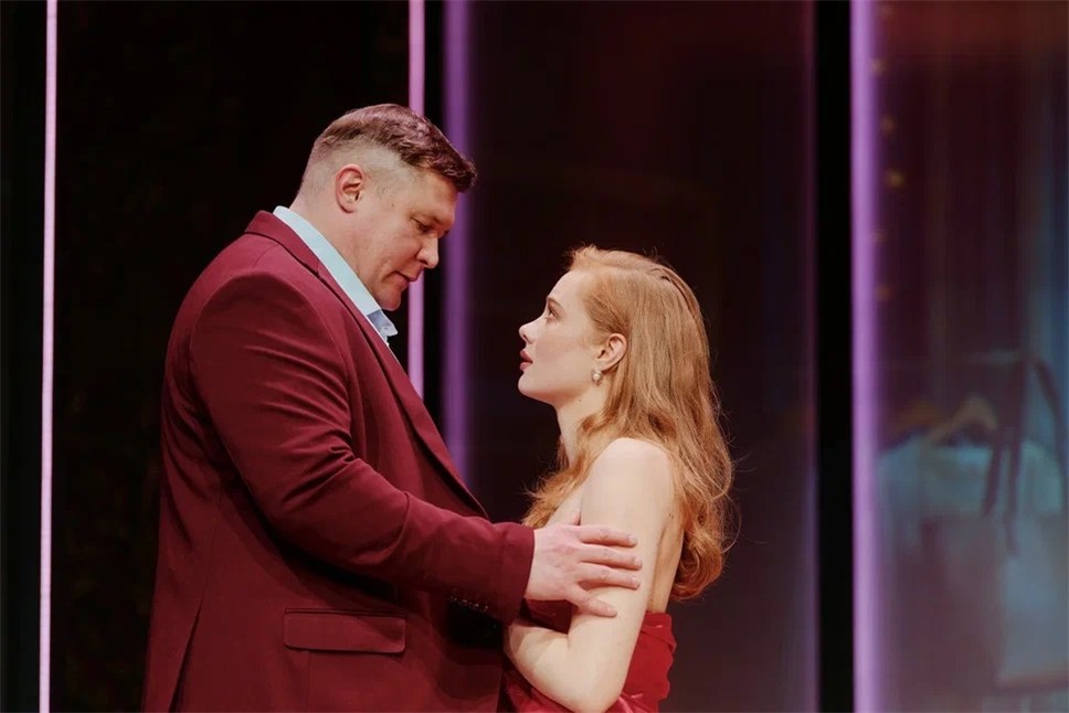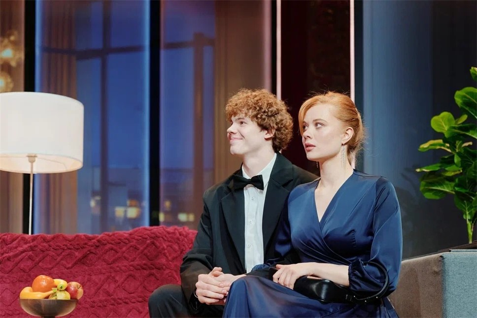 Сценография Анастасии Глебовой вполне соответствует замыслу авторов. Декорации построены по принципу "нескольких сцен сразу": помимо основной площадки, задействованы боковые зоны этого самого нарядного зала театра, которые превращаются в кухню, спальню или торговый зал. Это создаёт эффект параллельных реальностей и подчёркивает, как герои живут "в разных мирах", даже находясь рядом.