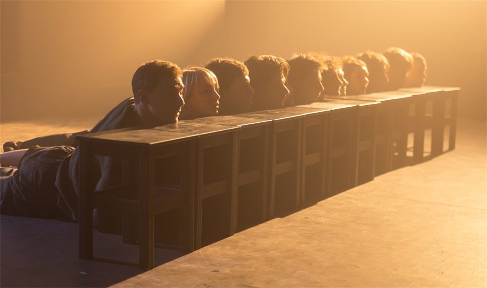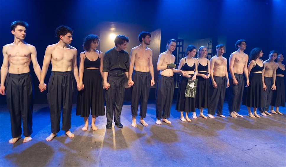 С самого начала мы видим деление артистов на людей и носорогов. Деление обозначено визуально. Люди одеты в серую одежду, носороги — с голым торсом.