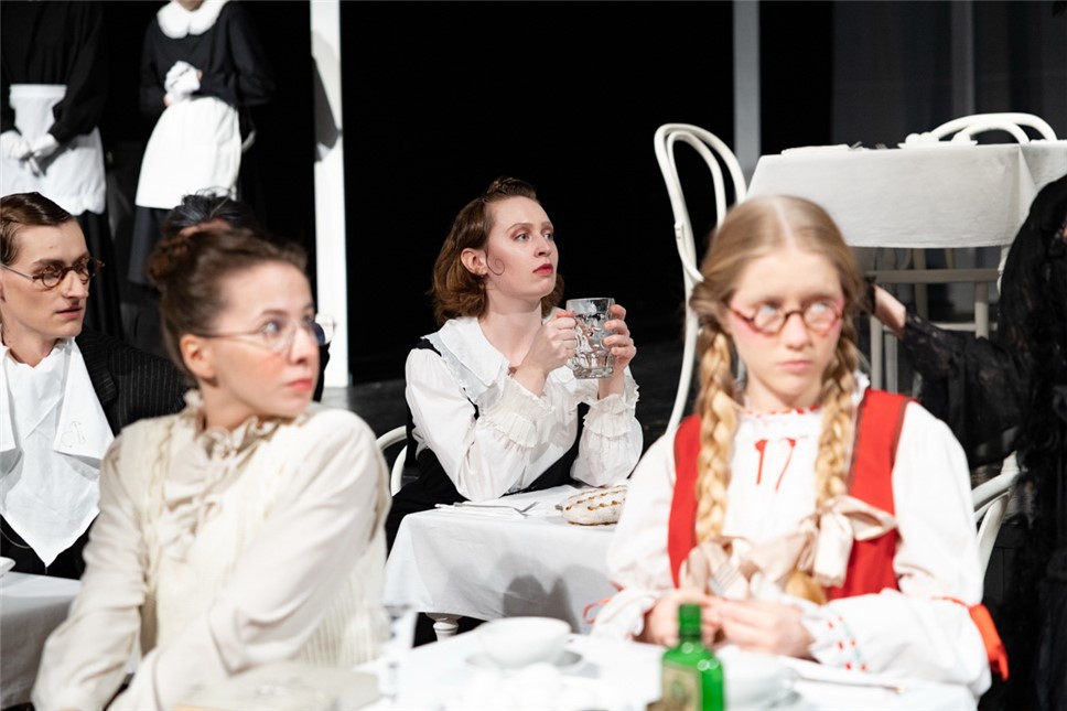 Именно поэтому каждая роль контрастна, в полном диапазоне от смешного к грустному. Нам показывают мастерство буквально каждого студента, все его грани, все его таланты. В спектакле практически отсутствует понятие – "главная роль". Все главные, и все массовка одновременно. И это правильно. Даже официанты, которые появляются на сцене совсем не часто – и то с характером, с четко проработанным образом. (Кстати, в спектакле два состава. В одном ребята – официанты и прочий обслуживающий персонал, в другом –исполнители главных ролей).