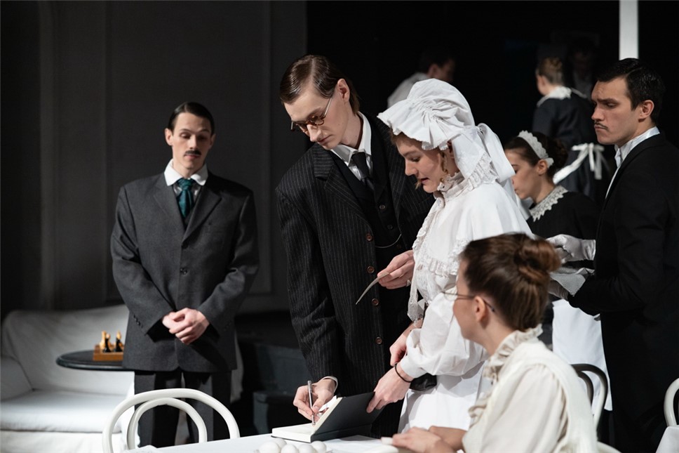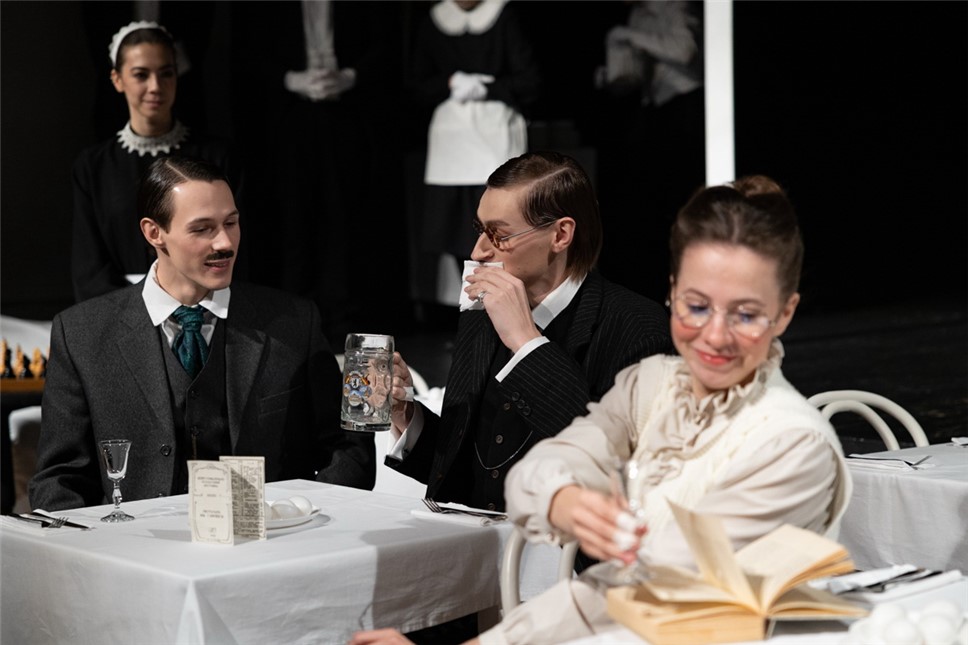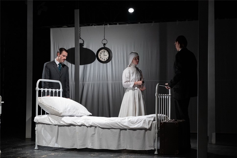 Спектакль прост, размерен, в большинстве сцен может вообще ничего не происходит: мы просто становимся свидетелями длинных диалогов, философских размышлений, но нерв действия цепляет, завораживает, увлекает. Буквально с первых секунд мы переносимся в элитную альпийскую клинику начала XX века, где много лет живут умирающие от туберкулеза люди. Они разные, они конфликтуют друг с другом, они в открытую ругаются. Они как бы находятся в заточении в этой золотой клетке. Каждый из них может в любой момент спуститься вниз с волшебной горы, и они хотят туда, но одновременно и боятся.