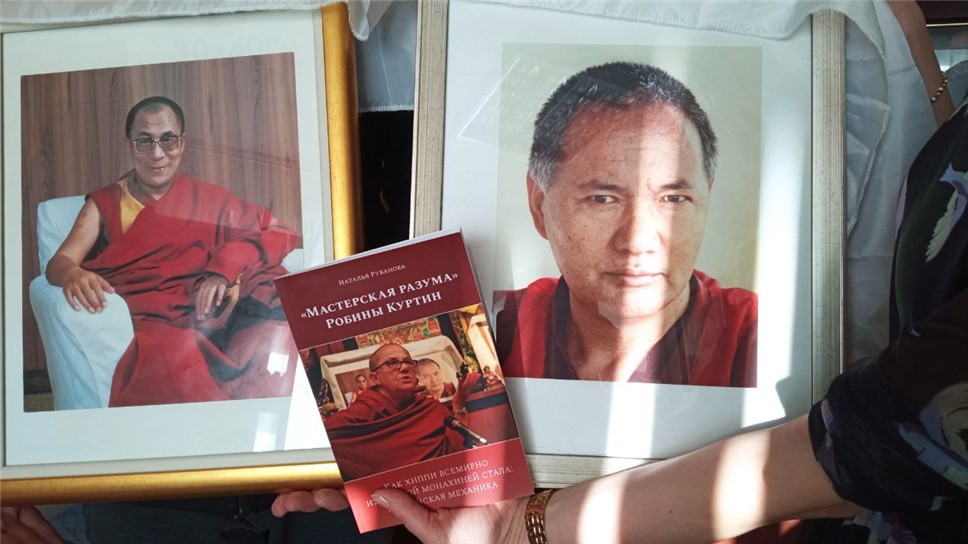 На обложку книги Натальи Рубановой «“Мастерская разума”» Робины Куртин» помещён портрет досточтимой как раз в момент её страстного общения с аудиторией. А за ней, на алтаре, – портреты Его Святейшества Далай-ламы и ламы Еше.