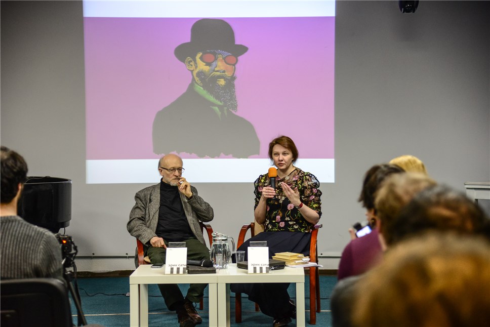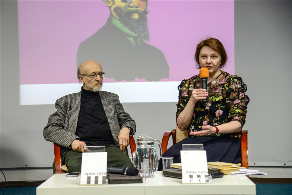 В конференц-зале столичной библиотеки им Некрасова биографию Сати представляли переводчик Елизавета Мирошникова и пианист, народный артист РФ Алексей Любимов: который исполнил фортепианный цикл Сати "Спорт и развлечения" под видеоряд, созданный немецким художником-видеографом Фалько Ристером.