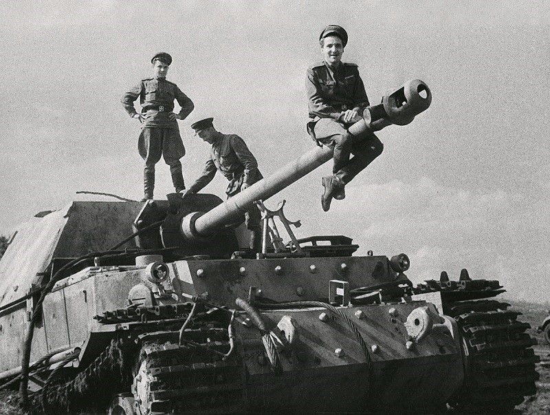Военкор Симонов сидит на стволе трофейной немецкой САУ "Фердинанд". Фото: Яков Халип/РИА Новости / "Профиль"