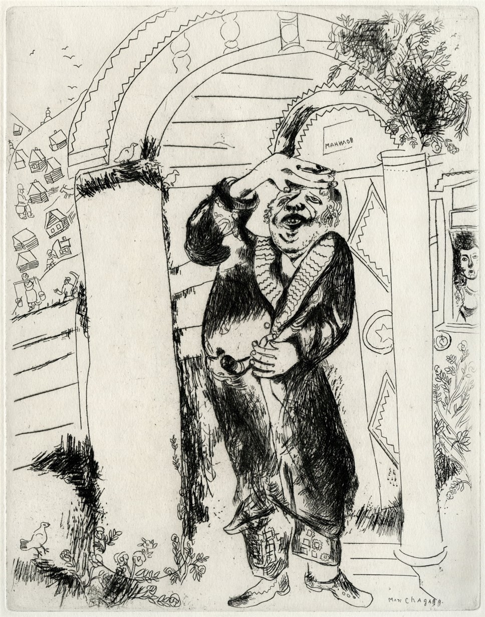 М. Шагал. Манилов. Из собрания Б.Фридмана. 1948Бездну характеров, выражение самых различных эмоций, поведения, жестов, улыбок и ужимок найдём мы в описании внешности и быта помещиков у Николая Васильевича Гоголя. Кто не помнит его знаменитых фраз: "Один бог разве мог сказать, какой был характер Манилова. Есть род людей, известных под именем: люди так себе, ни то ни се, ни в городе Богдан ни в селе Селифан, по словам пословицы", или знаменитого Ноздрёва — кутилы, разбитного малого, "в некотором отношении исторического человека", драчуна, любителя уездных ярмарок и совершенно бесцельного на них обмена разного рода товаров. Все, буквально все гоголевские типы на диво колоритны, а сменяемость их эмоций поражает своей быстротой. Это-то и сумел отобразить великий Марк Шагал. Гоголевский помещик на каждом офорте, в каждой работе — разный. Вглядитесь в лица помещиков, их позы, наклоны головы. Сатира, гротеск, гомерический хохот исходит от каждой работы, но в то же время офорты Шагала полны динамики, силы, а подчас — суеты.
