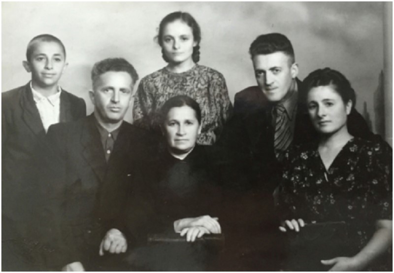 Семья Николая Капустина: мать Клавдия (первая справа), отец Гирш (второй справа), сестра Фира (по центру сзади), дядя по отцовской линии Михаил (второй слева), жена Михаила (по центру впереди), двоюродный брат Владимир (первый слева), 1948 г. Фото: книга "Разговоры с Николаем Капустиным".