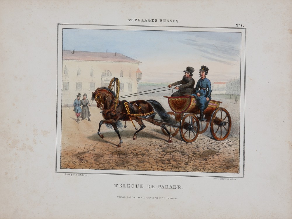 Отдельный и очень важный раздел выставки составляют жанровые альбомы, выпущенные издательством Дациаро. Если архитектурные виды показывали парадный, репрезентативный облик двух столиц, то жанровые листы обращались к повседневной жизни – к тем, кто населял эти города и села, кто трудился, торговал, развлекался, путешествовал. Дациаро подошел к бытовому жанру с неожиданной для коммерческого издателя серьезностью, стремясь создать не карикатурный, а уважительный и достоверный портрет русского народа. На выставке представлены листы из нескольких альбомов. Среди них «Русский альбом» за авторством П. М. Русселя, включающий сцены из жизни крестьянства и городских низов; «Русские упряжки» с рисунками выдающегося мастера анималистического жанра В. Ф. Тимма, который запечатлел многообразие русских повозок, саней и экипажей – от крестьянских розвальней до императорских карет; «Русские народные сцены» по рисункам Р. К. Жуковского, где оживают сцены ярмарок, гуляний, деревенских праздников и городских будней; а также серия, посвященная русской армии, выполненная по рисункам В. В. Адама – мастера батального жанра. Вместе с видами Москвы и Петербурга они создают объемную, многогранную картину старинной России – далекой, удивительной и невероятно притягательной.