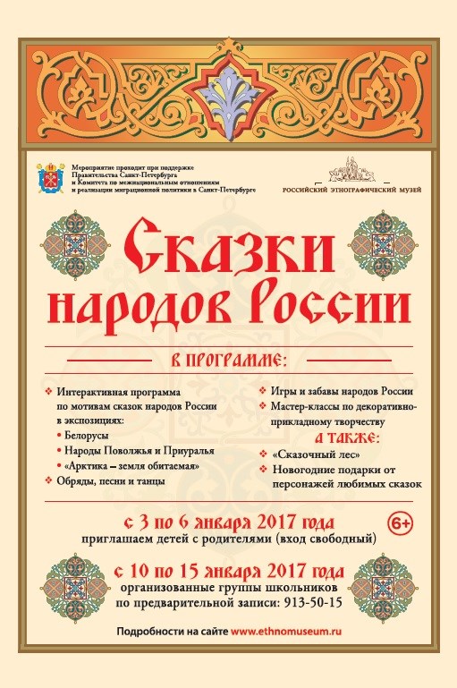 Для юных любителей чудес музей подготовил интерактивную программу по мотивам сказок народов России. Зрителей ждёт рассказ о белорусских, поволжских, приуральских и северных преданиях, основанный на этнографической экспозиции. Дети узнают об обрядовой культуре разных народов, разучат танцы и песни, смогут поучаствовать в различных играх и мастер-классах (например, плести из бересты или делать традиционных куколок).
