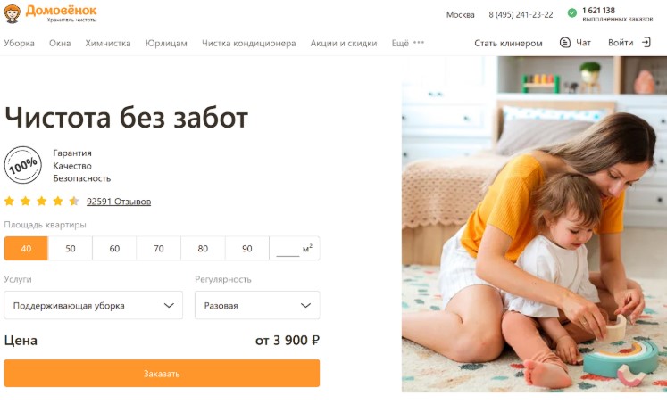 Домовенок - это клининг как сервис в айтишном смысле слова. Приложение, личный кабинет, выбор конкретного клинера, рейтинги исполнителей, прозрачная история заказов. Компании больше 18 лет, и за это время она вышла из гаражного формата в полноценную платформу. Для тех, кому важен контроль и удобство управления, это одно из лучших решений на рынке. Преимущество сервиса - скидки для постоянных клиентов до 30% и акции для новичков. Из осторожностей: в отзывах периодически всплывает, что новый клинер убирает хуже, чем привычный, - логика большого сервиса, где текучка неизбежна. Выход - закрепить за собой постоянного исполнителя, такая опция тут есть.