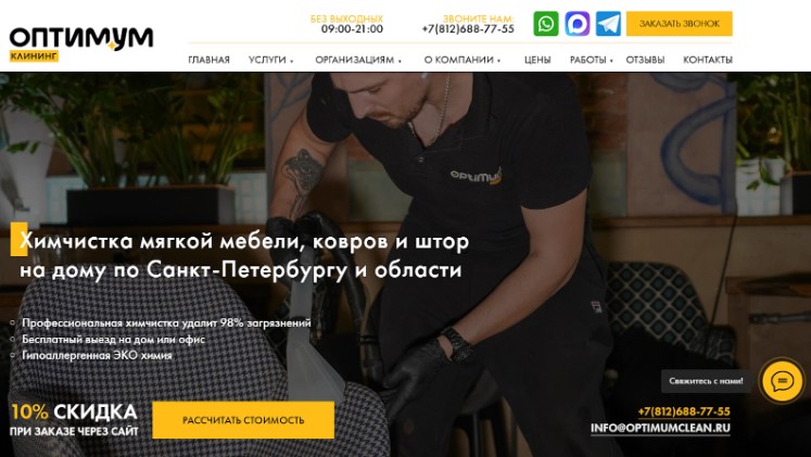 Если вам нужна именно химчистка дивана, матраса или кресла - Optimum Clean стоит рассмотреть в первую очередь. Компания выросла вокруг этой услуги и знает про выведение пятен с ткани, кажется, больше, чем среднестатистический учебник. Обычная уборка тоже в меню, но конек - работа с текстилем и мягкими поверхностями. Перед обработкой средство тестируют на незаметном участке, и это приятная деталь: значит, понимают, что бархат и микрофибра - это два разных мира. Оплата по факту, без предоплат.
