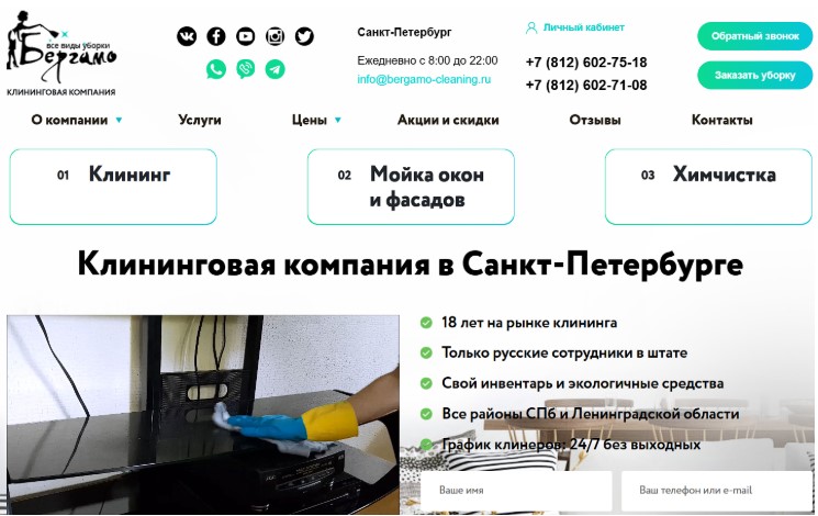 Bergamo - компания-ветеран: на рынке с 2007 года, а значит, пережила все кризисы, сезонные спады и наплывы конкурентов-однодневок. Для Петербурга это серьезный стаж. Профиль широкий: от обычной квартиры до мытья фасадов промышленными альпинистами - и это та самая деталь, которая выдает компанию с реальным опытом, а не с красиво оформленным лендингом. Берутся за уборку мероприятий, что тоже встречается редко: банкет на 200 человек оставляет после себя специфический хаос, и не каждый клининг к этому готов. Из минусов - отзывов на популярных площадках пока меньше, чем у лидеров рейтинга, и сайт выглядит чуть старомодно. Но тем, кто ищет проверенную годами бригаду, а не модный интерфейс, Bergamo подойдет.