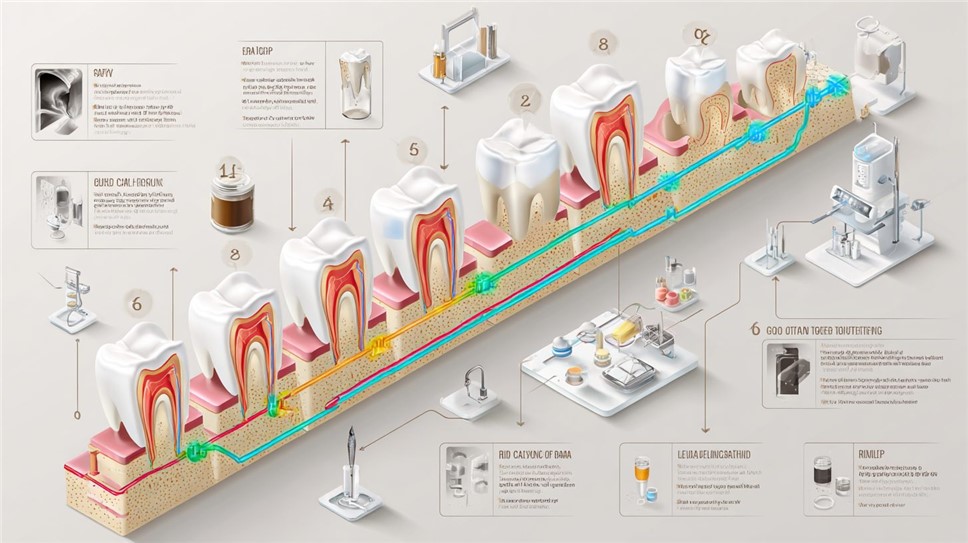 Иллюстрация последовательности эндодонтического лечения при пульпите.