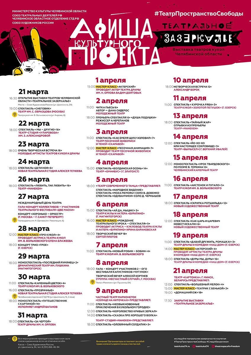 В рамках выставочного пространства в течение месяца будут проходить показы кукольных, драматических спектаклей, представления любительских студий, мастер-классы, экскурсии, театральные уроки и фотосессии, перформансы. На закрытие выставки, 21 апреля, приедет гость из Белоруссии. Светлана Бень – фронтменша популярного фрик-кабаре "Серебряная свадьба" и участница самобытного кукольного театра «Картонка» из г. Минска, проведет мастер-класс для желающих, на котором покажет, как можно сделать театральную куклу из подручного материала.