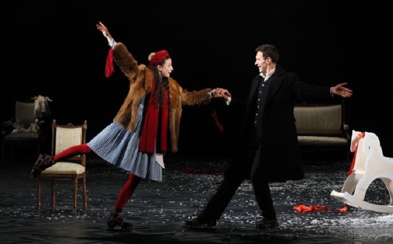 Ну и конечно – спектакль очень эффектен. Все сказанное выше приходит на ум потом, а с самого начала до конца трехчасового с лишним действия и простой зритель, и обозреватель сидят, что называется, с открытыми ртами. Огромная сцена театра практически пуста, отчего кажется какой-то необозримой. И над ней постоянно идет снег. Ловкая и масштабная театральная инженерия позволяет режиссеру вывести все действие как будто в открытое поле, где то падает легкий снежок, то разыгрывается настоящий буран, в котором почти не видно действующих лиц. И как забудешь яркий финал спектакля – Анна в самом прямом смысле исчезает в жестоком буране!