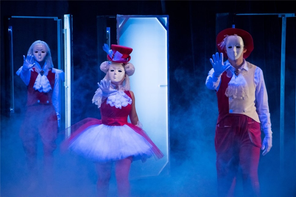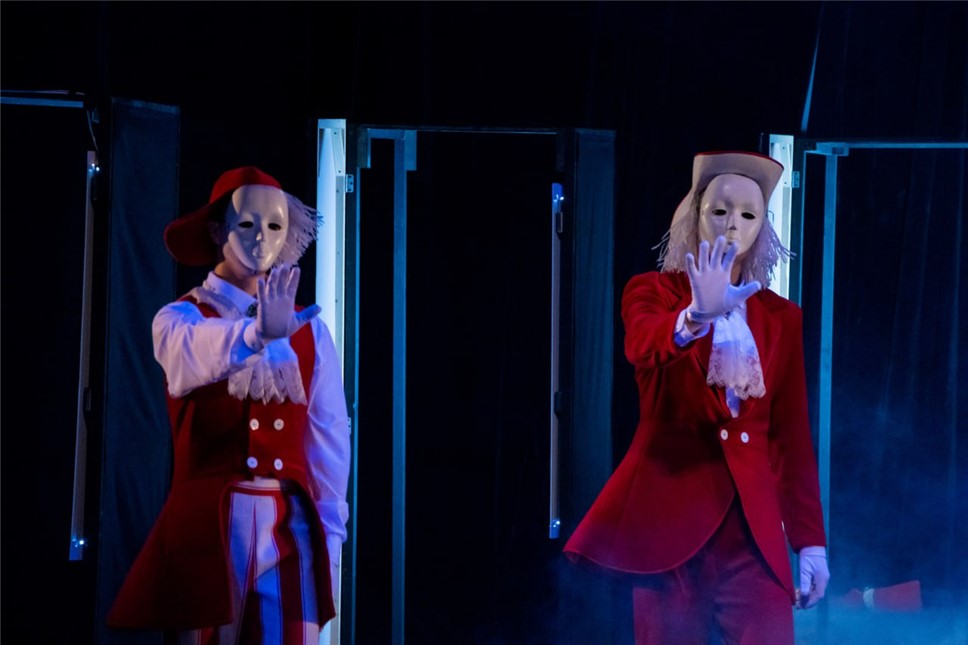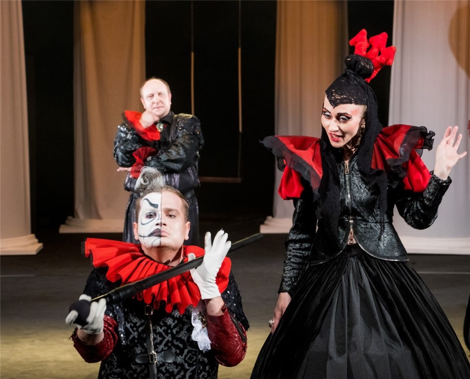 Судя по фарсу (именно такое жанровое определение), который в Русском драматическом театре Бишкека окрестили "Куклы", правы обе стороны. Спектакль действительно поставлен с элементами авангарда. Правда, это больше касается визуального и сценического решения. О художественном авангарде напоминают схематичные костюмы персонажей – одни почти полностью черные, другие в той же степени белые с красными декоративными элементами, все заметно геометрических очертаний. Освещение спектакля сделано так, что яркие прожектора выхватывают из полумрака сцены отдельные фигуры – и это создает даже гипнотический эффект вкупе с ненатуральными "ломаными" движениями персонажей. Причем так двигаются не только куклы, но и те, кто вроде бы люди… Именно это и является основой содержания пьесы, а за нею и фарса: что люди и куклы неразличимы, что все играют некие социальные или личные роли, что все в один момент манипулируют друг другом, а в следующий уже становятся марионетками в чьих-то более опытных руках. И такой подход, разумеется, классика классики. Он апеллирует к "намоленной" фразе Шекспира о том, что весь мир театр, а люди в нем актеры. И сам расклад пьесы – классический, скорее, средневековый, чем современный, и персонажи в нем – более функции, чем люди. Все это, безусловно, оправдывает применение термина "фарс" к сценическому проекту.