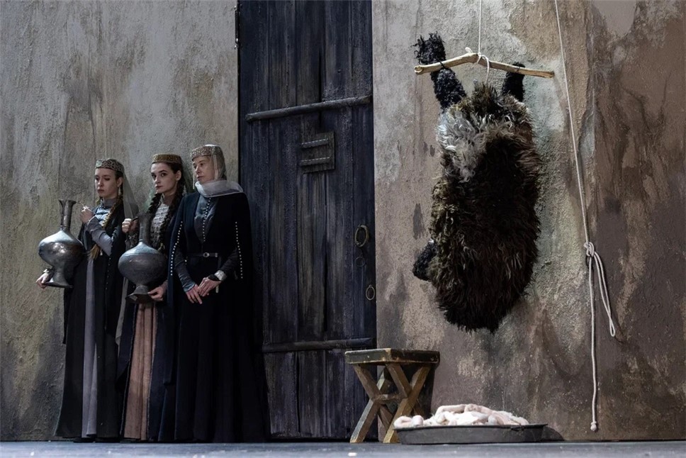 Тут кстати и рама этому демонизму — глухие стены как барьер между добром и злом. Как ни странно, Кончаловский углядел родство между шотландскими и кавказскими замками. И дело тут не только в архитектуре и больших кувшинах, а в принципе сценографии, которая достаточно аскетична. Нет пышных декораций, акцент сделан на символических деталях. Действие происходит во дворе: две глухие стены, в которых четыре двери. И они регулярно оказываются заперты перед героями, что тоже весьма символично. Световые контрасты (художник по свету — Нарек Туманян) также подчёркивают дуализм добра и зла. А пластические решения, придуманные хореографом Рамуне Ходоркайте, превращают массовые сцены в ритуальные действа — то ли безумный танец с саблями, то ли мистическое шаманство...