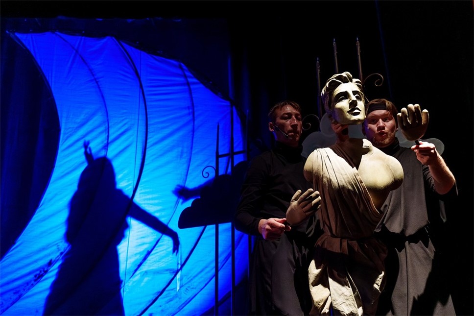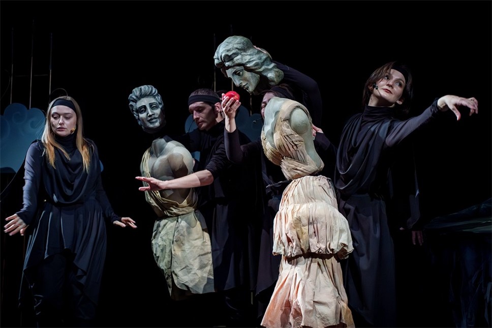 Художником спектакля выступил Тимур Гуляев. Привычные образы статуй греческих богов оживают на наших глазах. Они величественны и прекрасны. Но статуям не дано любить, надеяться, гневаться. А вот у кукол на сцене это прекрасно получается. Необычные куклы, изображения богов рождаются, кажется, на наших глазах – актер берет голову статуи, подбирает ей тело, и уже огромная паркетная кукла, которую водят два, а то и три артиста, оживает: шутит, ревнует, начинает принимать решения, спорить, ошибаться…
