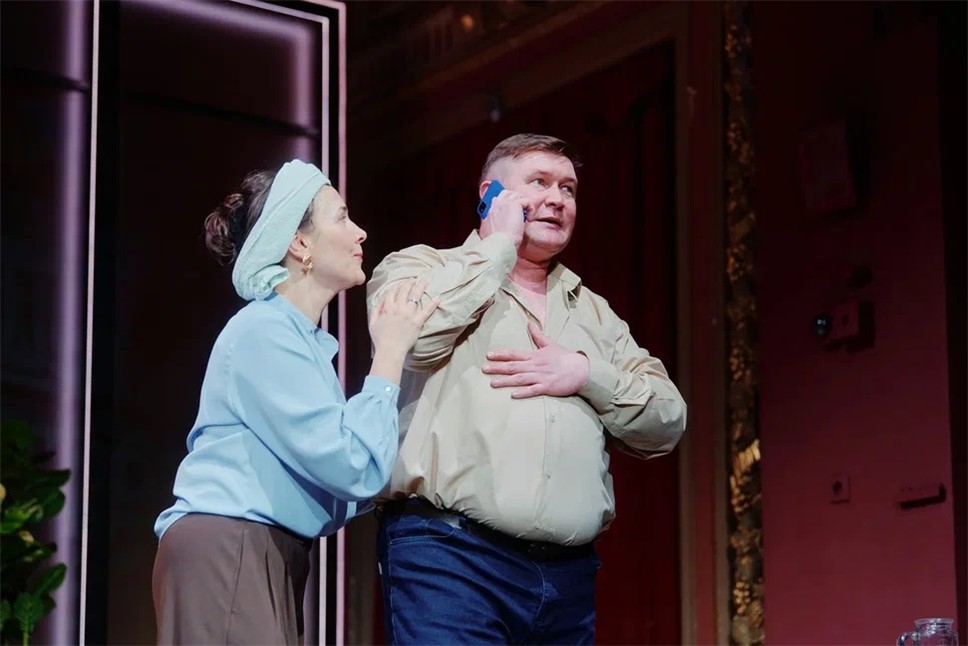 Сценография Анастасии Глебовой вполне соответствует замыслу авторов. Декорации построены по принципу "нескольких сцен сразу": помимо основной площадки, задействованы боковые зоны этого самого нарядного зала театра, которые превращаются в кухню, спальню или торговый зал. Это создаёт эффект параллельных реальностей и подчёркивает, как герои живут "в разных мирах", даже находясь рядом.