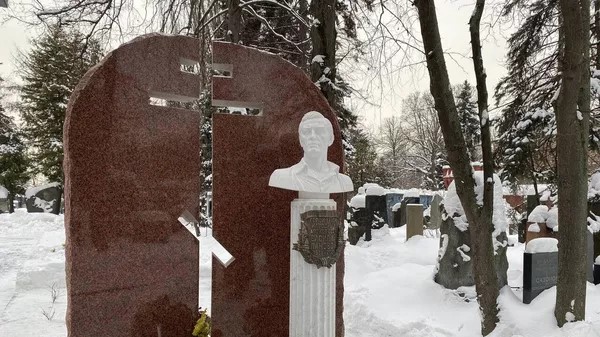 У подножия памятника лежат цветы от родственников и поклонников советского актёра. Недалеко от могилы