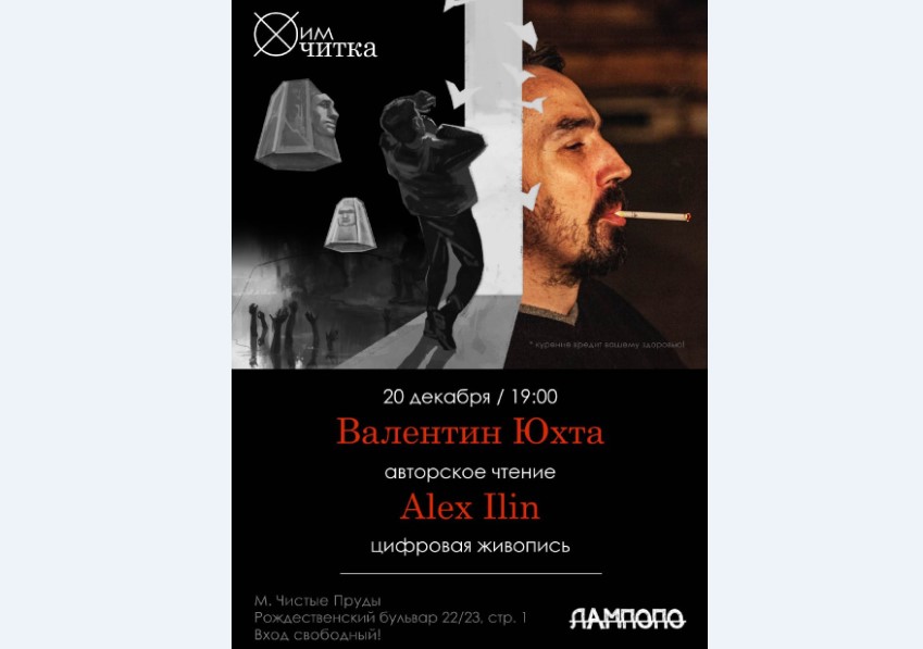 В пятницу, 20 декабря, в 19:00 в Кинорюмочной ЛАМПОПО (Рождественский бульвар 22/23, стр. 1) в рамках проекта "ХимЧитка" состоится авторское чтение рассказа Валентина Юхты (Юрьева) — писателя, педагога, кандидата филологических наук. Ранее Юхта выступал с Сергеем Летовым и Московским театром поэтов Влада Маленко в Перми.