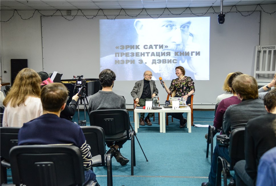 В конференц-зале столичной библиотеки им Некрасова биографию Сати представляли переводчик Елизавета Мирошникова и пианист, народный артист РФ Алексей Любимов: который исполнил фортепианный цикл Сати "Спорт и развлечения" под видеоряд, созданный немецким художником-видеографом Фалько Ристером.