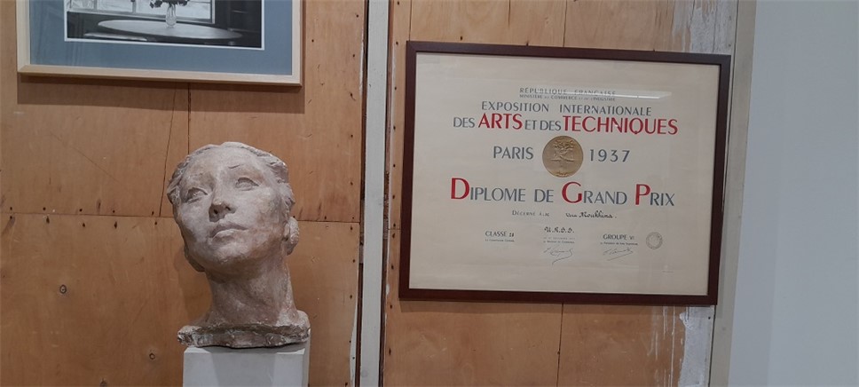 Экспонаты юбилейной выставки: голова балерины Галины Улановой и один из многочисленных дипломов Веры Мухиной. Фото Е. Сафроновой.