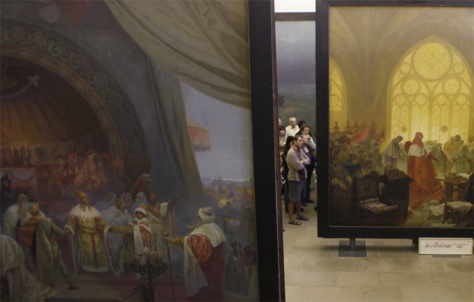 Напомним, Альфонс Муха писал цикл в течение 18 лет. Это картины размером 6 на 8 метров с изображением самых важных этапов истории славян. Таковыми художник считал казнь Яна Гуса в 1415 году, разгром крестоносцев славянским войском под Грюнвальдом в 1410 году, отмену крепостного права в России в 1861 году. Сейчас все картины находятся в депозитарии пражской картинной галереи и недоступны публике. Ориентировочная стоимость цикла составляет 10 миллиардов крон (около 435 миллионов долларов).
