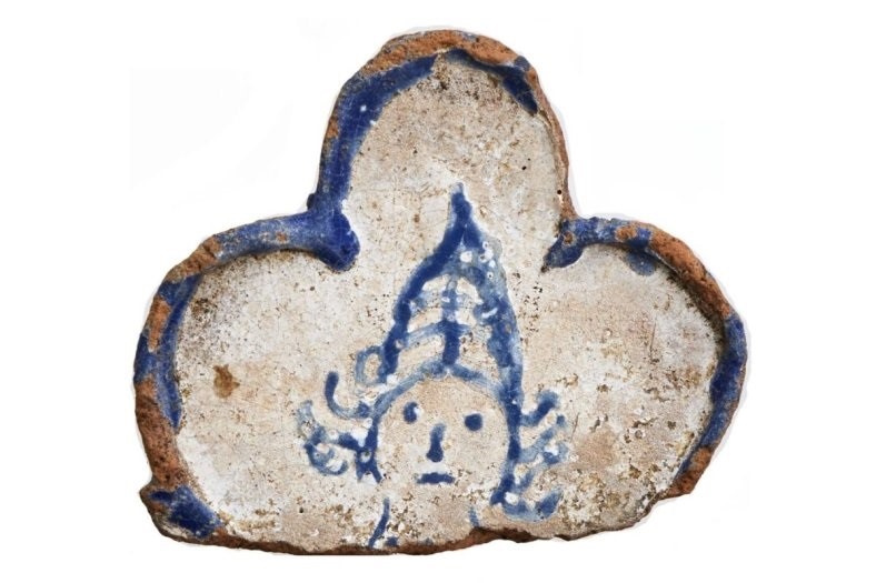 Изыскатели обнаружили изразец, бывший некогда трехчастным завершением фигурного городка. На нем была нарисована голова человека в своеобразном головном уборе, треугольном колпаке в полоску, не скрывающем непричесанные волосы. Научные сотрудники ИА РАН сочли, что этот образ – не просто "примитивизм". Он отражает конкретное лицо со своим характером.