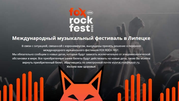 Стало известно, что музыкальный рок-фестиваль в Липецке Fox Rock Fest, который был намечен на 24-26 июня на Зеленом острове, откладывается на неопределенный срок. Об этом его организаторы заявили в официальной группе фестиваля в соцсети "ВКонтакте".
