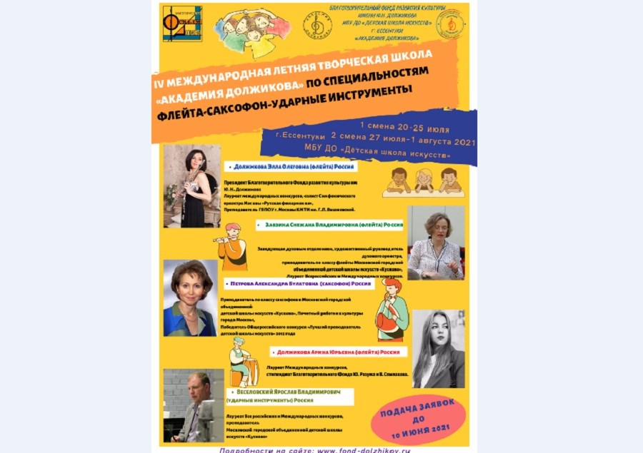 IV Международная летняя творческая школа "Академия Должикова", организованная Благотворительным фондом развития культуры имени Ю.Н. Должикова приглашает принять участие в занятиях по специальностям флейта, саксофон, ударные инструменты.