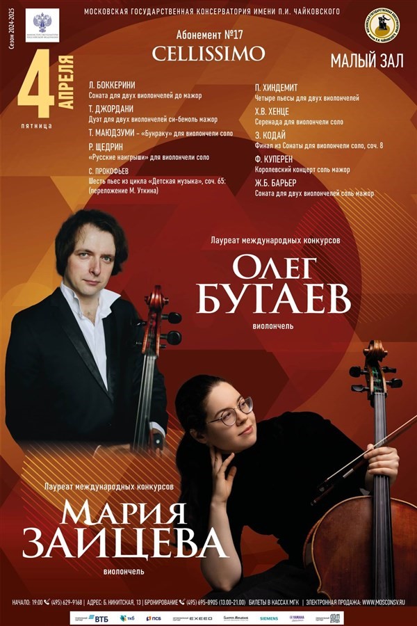 В программе концерта абонемента "Cellissimo" прозвучат произведения для виолончели соло и для двух виолончелей Л. Боккерини, Ф. Куперена, Т. Джордани, Ж. Б. Барьера, П. Хиндемита, З. Кодая, Х. В. Хенце, Т. Маюдзуми, С. Прокофьева, Р. Щедрина.