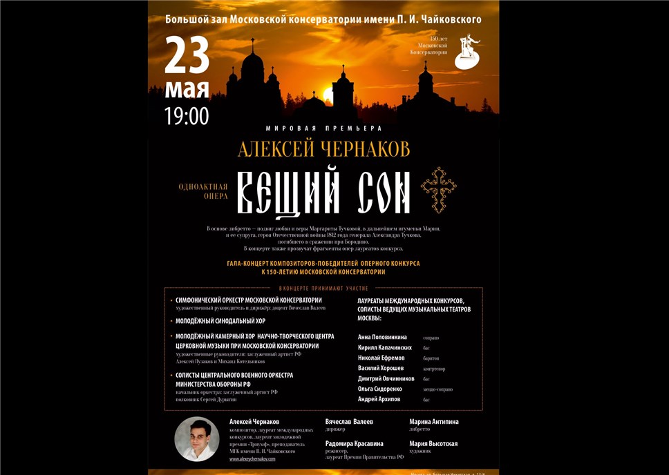 "Меня глубоко тронула эта история, которую я впервые услышал в Спасо-Бородинском монастыре, — рассказывает автор оперы Алексей Чернаков. — Когда приезжаешь в Бородино, всегда ощущаешь живое дыхание истории, осознаешь, что все это происходило совсем рядом. И хотя уже более 200 лет прошло с тех пор, понимаешь, что люди, которые отдали самое ценное — саму жизнь свою ради России, были такие же, как мы, — не какие-то былинные герои. Они тоже хотели жить, тоже хотели любви, счастья, но в тяжелый для страны момент принесли все это в жертву, как генерал Александр Тучков, который совершил подвиг в этом сражении. Бородинское поле — это огромная трагедия: столько погибших!.. И вдруг близко-близко видишь ужас смерти одного человека — для другого. Маргарита остается жить на месте гибели мужа: сначала в сторожке, затем там же основывает приют для обездоленных, передает все деньги на строительство монастыря, принимает постриг, становится игуменьей Марией. Все свои силы она отдает делу помощи нуждающимся и молитвам за погибших. Это жизненный подвиг Маргариты кажется мне продолжением ратного подвига ее мужа Александра. Когда в консерватории был объявлен конкурс, я решил участвовать. Стали искать сюжет и вспомнили о нашей поездке в Бородино, об испытанном потрясении, и это было как открытие! К тому же в этом сюжете есть все для спектакля, ничего и придумывать не нужно. Но самое главное — в том, что это наша живая история, в ней все настоящее и все истинное! Для меня это было решающим моментом".