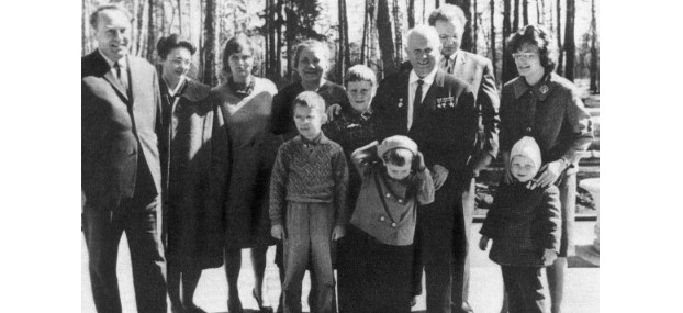 Семья Никиты Хрущёва (слева направо): зять Алексей Аджубей, дочери Елена и Рада, жена Нина Петровна, внуки Алёша, Никита и Ваня, Никита Хрущёв, сын Сергей, невестка Галина, внук Никита, 1963 г. Фото: РИА Новости