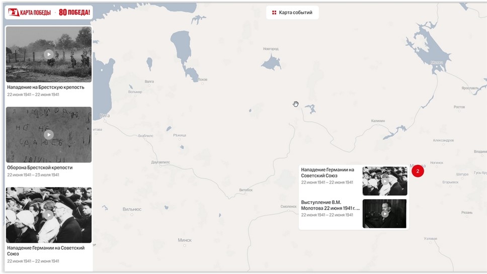 В России заработал мультимедийный проект "Карта Победы". Эта карта призвана стать вспомогательным инструментом изучения военной истории для школьников и студентов, также она может использоваться для самостоятельного изучения всеми желающими.