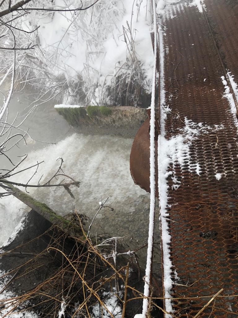 И мы наблюдаем: с территории спиртзавода в реку выведена огромная ржавая труба. Из нее прямо в реку вытекает водопадом вонючая жижа-кипяток, образуя вокруг пар, и тот самый сбивающий с ног тошнотворный запах.